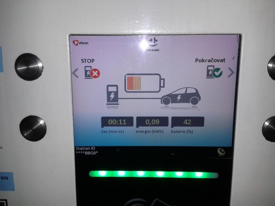 Platbu tentokráte neřeším, půjčeným čipem ČEZ jsem stojan zapnul a čerpal, bez ohledu na výšku odběru. Majitel čipu hradí měsíčně paušální platbu 544,50 Kč s DPH bez ohledu na to, zda nabíjí a kolik, nebo vůbec ne. Já mezitím peníze utratil v bufetu místní čerpací stanice, která je velmi dobře zásobená a slušně vaří.